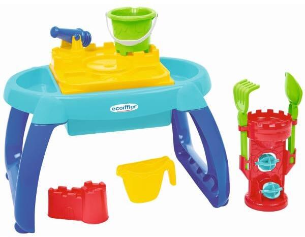 Blatul mesei pentru joacă cu nisip și apă este împărțit în trei părți. Pe cea din mijloc se pun o sită mare, o râșniță și un tun. Include greblă, lopată, găleată, ceainic și matriță de nisip. Dimensiuni masă: 50 x 37 x 30 cm (lxhxh), dimensiuni masă incl. polizor cu lopata si grebla: 50 x 37 x 66 cm (lxhxh). Fabricat în Franța. Pentru copii de la 3 ani
