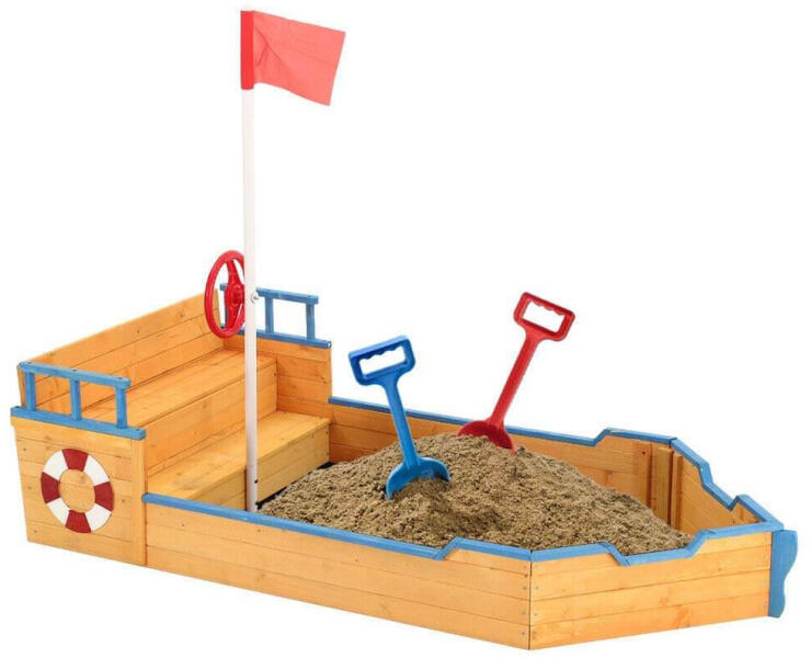 Această ladă cu nisip în formă de corabie de pirați nu este doar o jucărie, ci o poartă către tărâmul imaginației copiilor. Timona, steagul și designul autentic fascinează orice copil, încurajându-i să-și elibereze fantezia în timpul aventurilor din grădină. O alegere ideală pentru activități în aer liber, care stimulează creativitatea și abilitățile motorii. Design unicCu lada cu nisip în formă de corabie, copiii se pot simți ca adevărați căpitani! Proiectată cu prora corabiei, timonă și steag, oferă un aspect realist, în timp ce platforma din spatele corabiei adaugă și mai multe posibilități de joacă. Această ladă cu nisip este mai mult decât o jucărie – este o lume proprie de aventuri. Materiale de calitate și design practicLada este fabricată din lemn de pin și accesorii durabile din plastic, fiind rezistentă la intemperii. Secțiunea de nisip, cu o adâncime de 20 cm, poate fi umplută până la 13 cm cu nisip, oferind suficient spațiu pentru construcții și jocuri. Dimensiunile compacte (94x187 cm) permit amplasarea facilă în grădină. Asamblare simplă și joacă sigurăToate piesele necesare pentru asamblare sunt incluse în pachet, ceea ce face instalarea rapidă și ușoară. Banca de 48 cm înălțime și spătarul de 19 cm asigură o ședere confortabilă și sigură pentru copii. Catargul și timona cu diametrul de 23 cm adaugă o experiență de joacă suplimentară. Incap aproximativ 170,88 kg pana la 181,56 kg de nisip, in functie de densitatea nisipului, care poate fi de 1,6 kg/litru sau 1,7 kg/litru. Caracteristicile produsului:Adâncimea compartimentului pentru nisip: 20 cmMaterial: pin, plasticUmplere cu nisip: până la 13 cm înălțimeÎnălțimea băncii: 48 cmÎnălțimea spătarului: 19 cmDimensiunile băncii inferioare: 17x13 cmÎnălțimea părții frontale a corabiei: 24 cmÎnălțimea catargului: 137 cmDiametrul timonei: 23 cmConținutul pachetului- Elemente pentru lada cu nisip în formă de corabie- Timonă și steag- Toate piesele necesare pentru asamblare- Instrucțiuni de montajAdu un strop de aventură în grădina ta cu această ladă cu nisip unică, care va deveni locul preferat al copiilor!