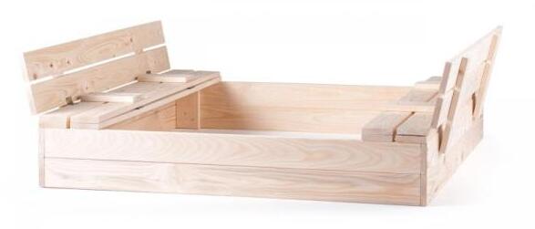 Cutia de nisip din lemn masiv este echipată cu un capac care protejează nisipul de animale, frunze căzute și alte impurități atunci când copiii nu se joacă în ea. Când copiii se joacă în cutia de nisip, capacul este deschis și se transformă în bănci, care permit o ședere confortabilă în timpul jocului.   Dimensiune: 120 x 113 x 19 cmVârstă: 3+